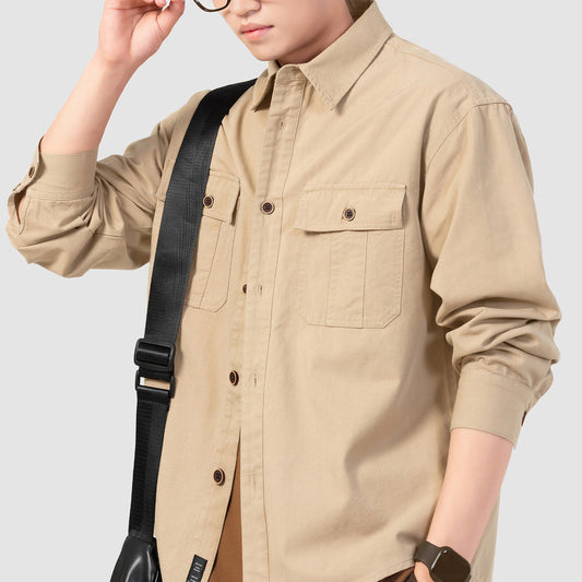 春季美式休閑cleanfit卡其色襯衣簡約工裝寸衫男外套長袖